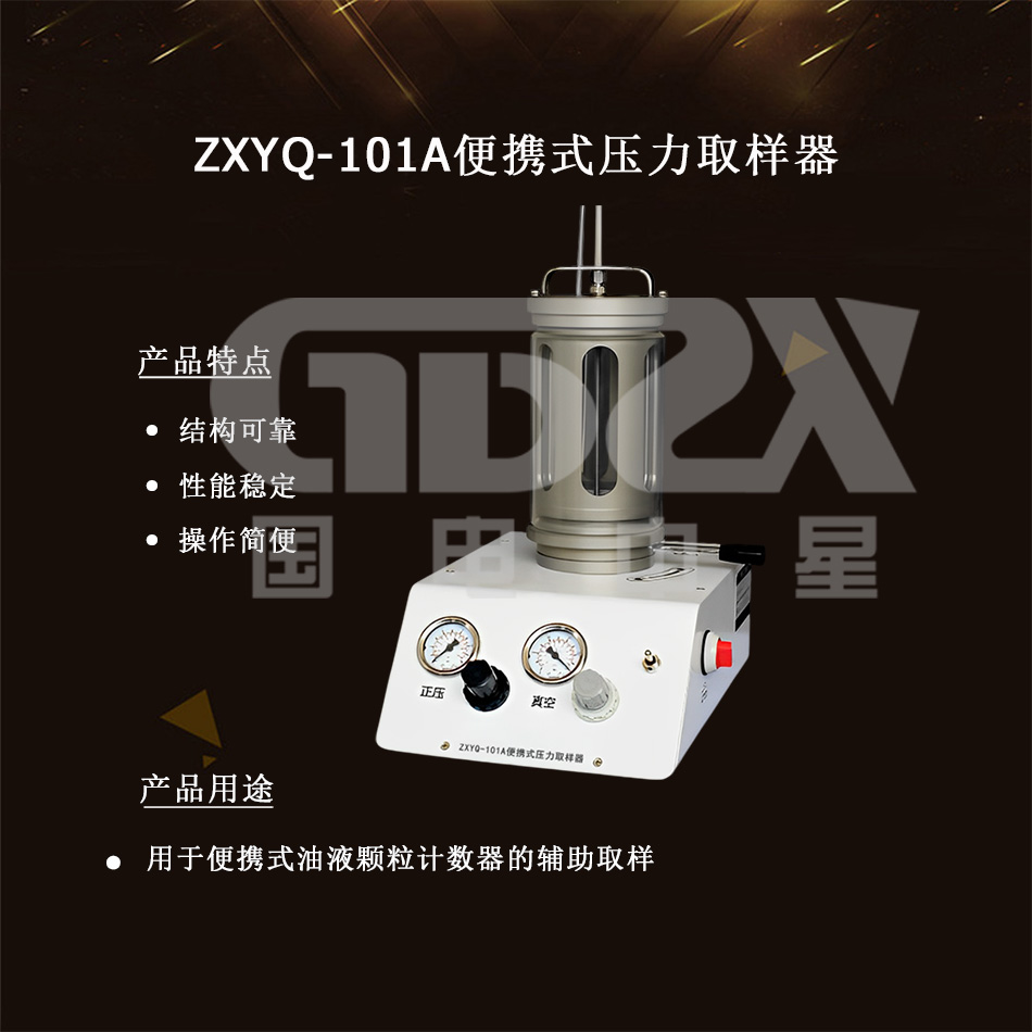 ZXYQ-101A便攜式壓力取樣器是一款用于輔助高粘度樣品取樣的裝置,可用于便攜式油液顆粒計數器的輔助取樣。壓力取樣器內置壓力泵,可在正負壓之間直接切換,可以儲存并長時間保持壓力,具有結構可靠、性能穩定的優點。本取樣器操作簡便,壓力范圍寬,應用廣泛。