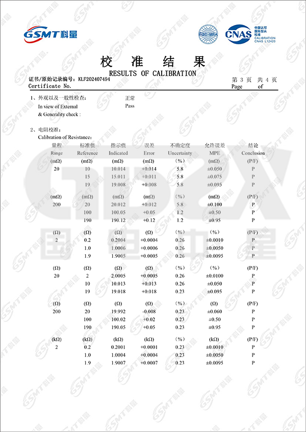 3. 分辨率:1μΩ(20mΩ檔);10μΩ(200mΩ檔);0.1mΩ(2Ω檔);1mΩ(20Ω檔);10mΩ(200Ω檔);0.1Ω(2000Ω檔) 。