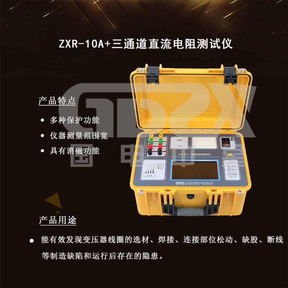 變壓器的直流電阻是變壓器制造中半成品、成品出廠試驗、安裝、交接試驗及電力部門預防性試驗的必測項目,能有效發現變壓器線圈的選材、焊接、連接部位松動、缺股、斷線等制造缺陷和運行后存在的隱患。為了滿足變壓器直流電阻快速測量的需要,我公司利用自身技術優勢研制了ZXR-10A+三通道直流電阻測試儀。本儀器是集單相測試和三相測試(Yn,Y,△)功能于一體的新型快速測試儀,是測量大型電力變壓器直流電阻的理想設備。屏幕采用大屏幕高分辨率液晶顯示屏,方便現場使用,具有中文菜單提示功能,操作簡便直觀,一次接線完成所有直阻測試項目,測試速度快,準確度高,量程寬。