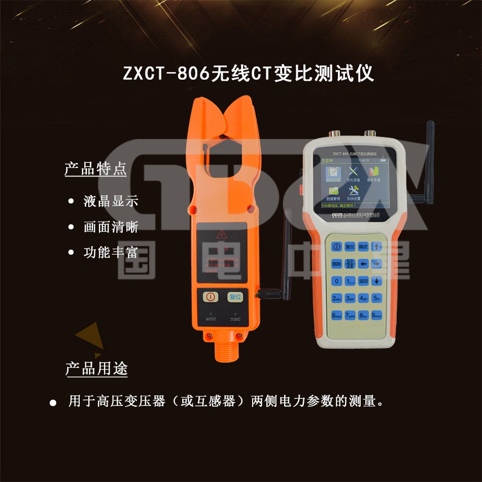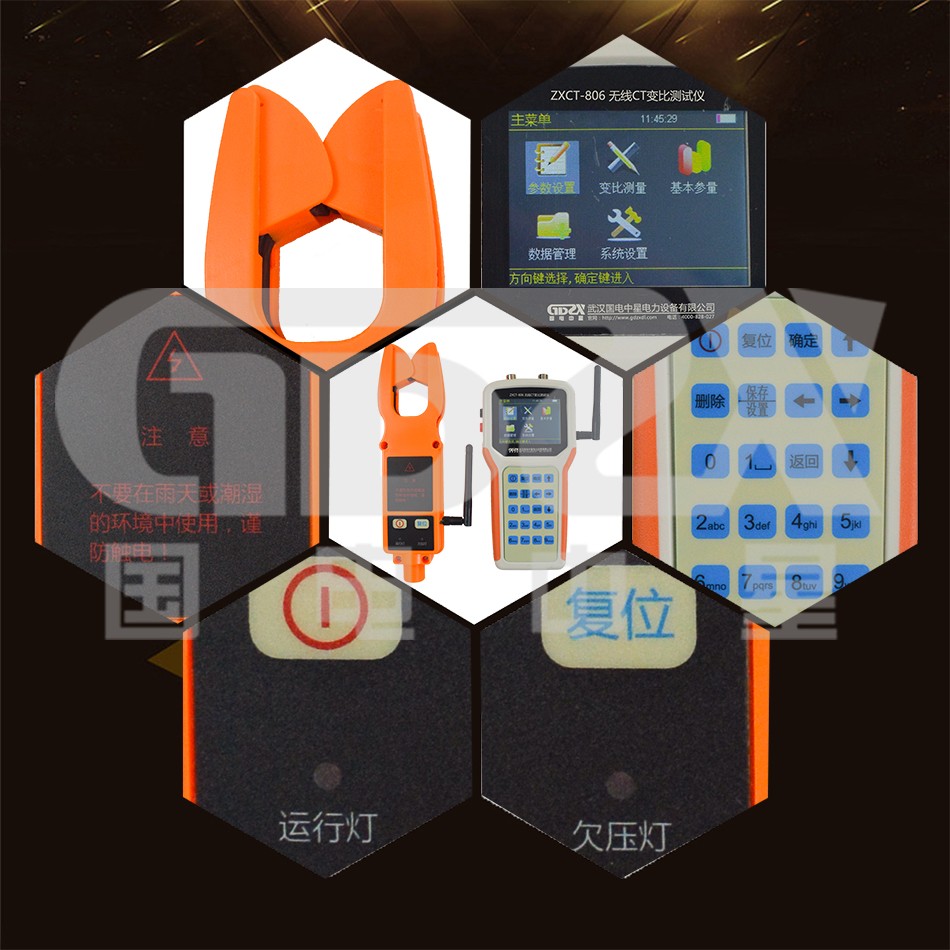 ZXCT-806無線CT變比測試儀是本公司憑借生產智能化儀表的多年經驗積累,適應用戶現場需求而推出的。主要用于高壓變壓器(或互感器)兩側電力參數的測量。可實現一路二次側電壓,一路一次側電流和一路二次側電流的同時測量,顯示幅值、變比,變比誤差,相角(各路信號之間),功率因數(電壓與二次測電流之間),有功功率,無功功率等參數的測量和計算以及一次側電流和二次側電流極性相別的判斷。一次電流可選擇鉗形電流表,也可選擇無線高壓鉗。無線高壓鉗所采集的電流信號,將采用無線傳輸方式發送到手持式主機,主機則直接采集低壓電流互感器二次電流。主機將根據鉗表兩側信號,實時計算電流互感器一次,二次變比、變比誤差和相角,以保證操作過程的安全性與可靠性。抽拉式高壓絕緣操作桿伸長可達5米,確保操作過程的人身安全。本測試儀具有新型實用、外形美觀、攜帶方便、抗干擾能力強、運行穩定可靠等突出特點。現場不拆線、不斷電的情況下即可準確測量。