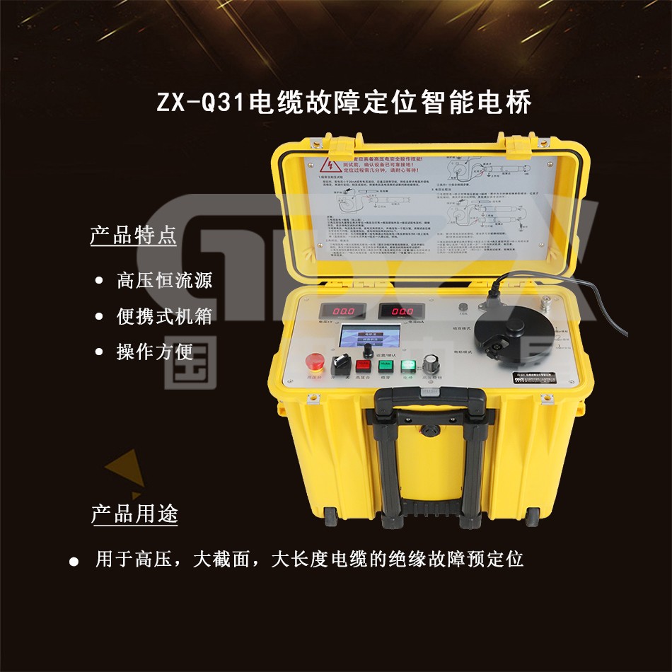 ZX-Q31電纜故障定位智能電橋集燒穿和智能電橋于一體的高壓電纜系統(tǒng)絕緣故障定位智能電橋,可以快速將高殘壓電纜故障燒成低阻。智能電橋最大電流600mA,適合于高壓,大截面,大長(zhǎng)度電纜的絕緣故障預(yù)定位。大電流可大幅度提高故障距離測(cè)量精度。