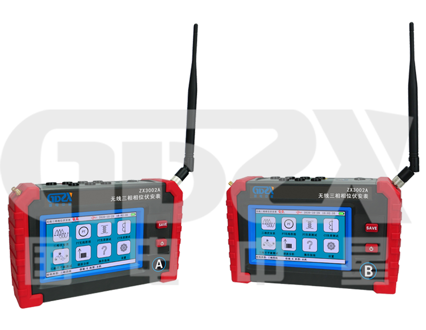 ZX3002A無(wú)線三相相位伏安表由2臺(tái)手持終端、6個(gè)電流鉗、2組電壓測(cè)試線等組成,手持終端具有5英寸觸摸彩屏,中文界面,大容量鋰電池,USB接口。單機(jī)具有三相伏安表、PT負(fù)荷測(cè)試、CT負(fù)荷測(cè)試、三相不平衡度測(cè)試、諧波分析等功能。雙機(jī)具有無(wú)線三相相位伏安表、無(wú)線PT核相等功能。采用GPS衛(wèi)星授時(shí)及LORA無(wú)線通訊技術(shù),確保同步測(cè)試更準(zhǔn)確。四機(jī)同時(shí)使用時(shí),可將一臺(tái)設(shè)置為主機(jī),另三臺(tái)設(shè)置為從機(jī),特別適合多點(diǎn)同步測(cè)試,使用靈活方便。儀表帶有藍(lán)牙通訊,安裝APP后可在手機(jī)進(jìn)行測(cè)試或查看測(cè)試記錄。在變電站內(nèi)不同位置無(wú)線同步測(cè)量電流、電壓、相位、頻率等電力參數(shù),無(wú)線PT核相,負(fù)荷測(cè)試、三相不平衡度測(cè)試、諧波測(cè)試。