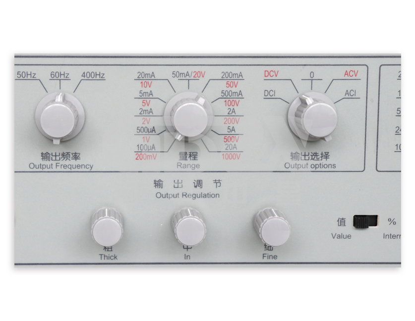 2. 交、直流電流輸出范圍為:0~100uA~500uA~2mA~5mA~20mA~50mA~200mA~500mA~2A~5A~20A。