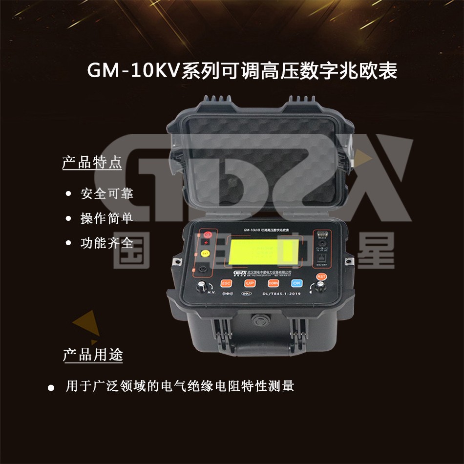 GM-10kV系列可調高壓數字兆歐表測試儀器是國電中星為解決高壓變電站、發電廠現場強干擾下對大型高壓變壓器、電機電器、遠程電力電纜或埋設電纜等電氣絕緣電阻特性的測試而設計研制。它亦可用于廣泛領域的電氣絕緣電阻特性測量。