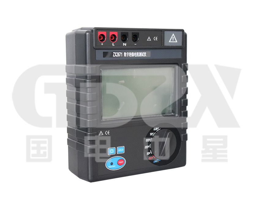 ZX2671數字絕緣電阻測試儀是一款高性能數字式儀表,具有LCD大屏幕帶背光顯示、數據保持、自動放電、自動關機等功能。,儀表具有測試計時,電壓監測功能,回路電壓大于36V時,儀表將禁止測試以保護被測物及人員安全。緣電阻值,測試時間,輸出電壓同屏顯示,同時還具備測量交流電壓、直流電壓功能。