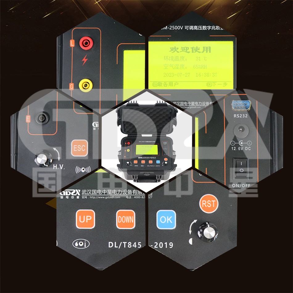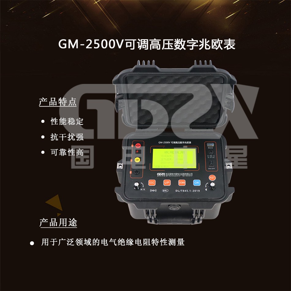 GM-2500V可調高壓數字兆歐表是我司為解決高壓變電站、發電廠現場強干擾下對大型高壓變壓器、電機電器、遠程電力電纜或埋設電纜等電氣絕緣電阻特性的測試而設計研制。它亦可用于廣泛領域的電氣絕緣電阻特性測量。